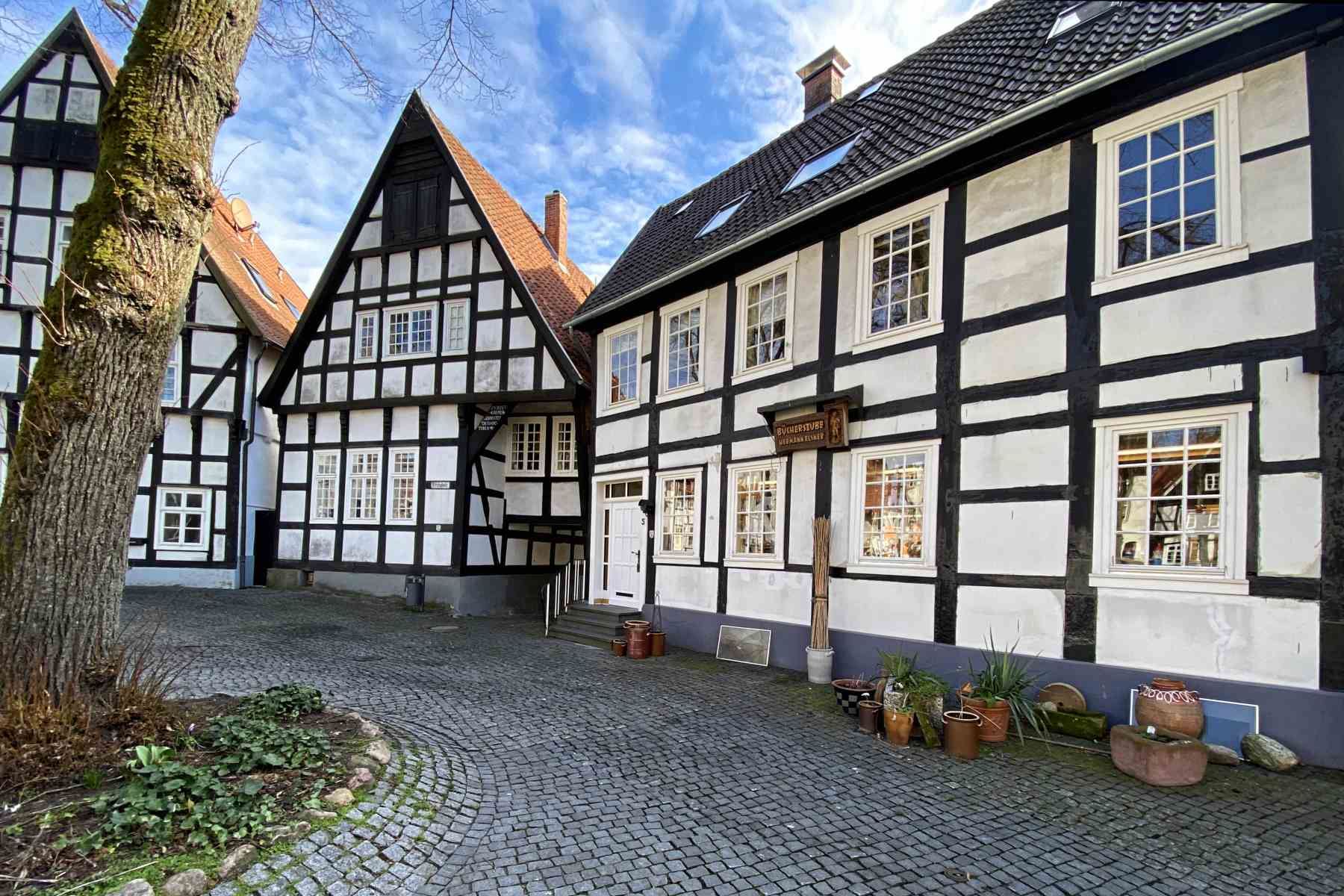 Die Hauptattraktion der westfälischen Stadt ist das Haller Herz : Ein Ring von typisch westfälischer Fachwerkhäuser umsäumt den Kirchplatz.